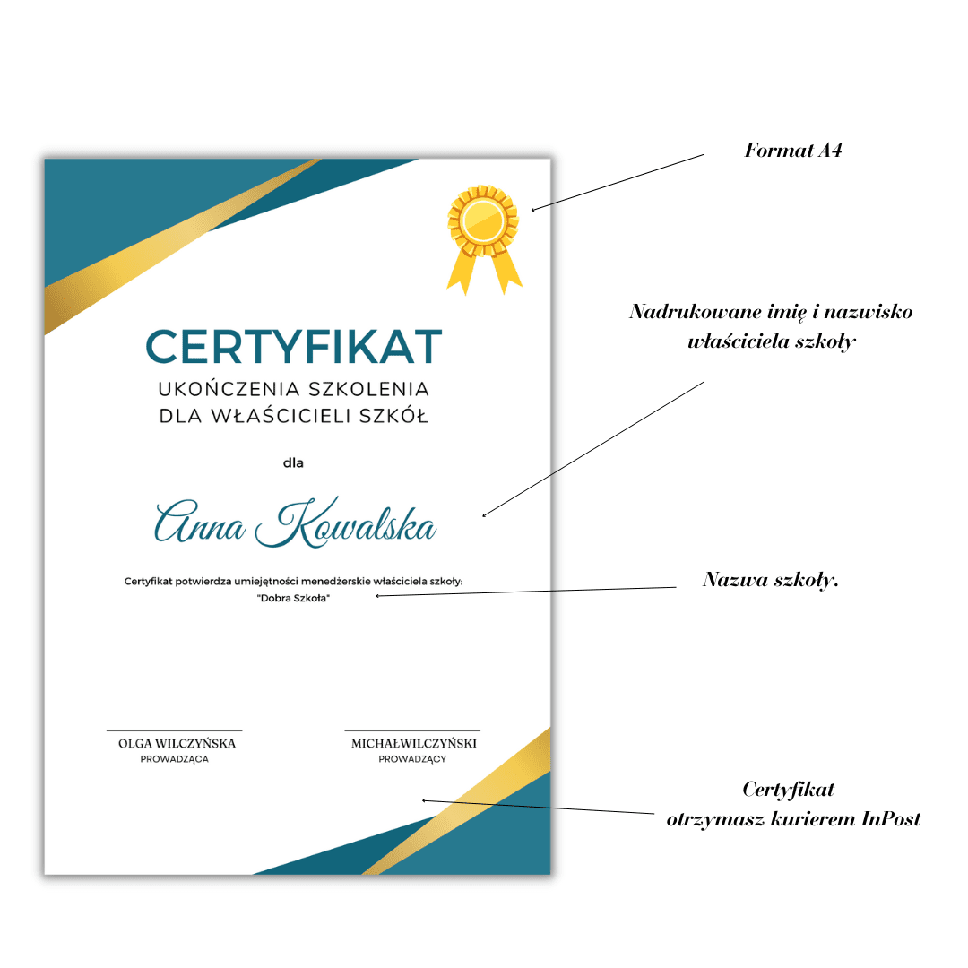 - imienny certyfikat ukończenia szkolenia dla osób obecnych na minimum 8 spotkaniach. Dyplom otrzymasz kurierem.